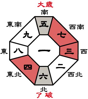 北(六白金星)は歳破のため凶方位となります。